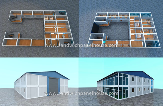 II. Design description This prefab office prefabricated container house is designed for construction sites. The office building is with a double slope steel roof, making it could be placed where there is a lot of rain.