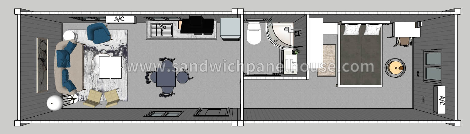 Our sanwich panel container structure allows many units to be connected together can be adjusted to suit a small family, big family or even two families, also can be used as schools, medical centers, clinics, offices, laundry, entertainment areas, toilets and showers, canteens Other social facilities.